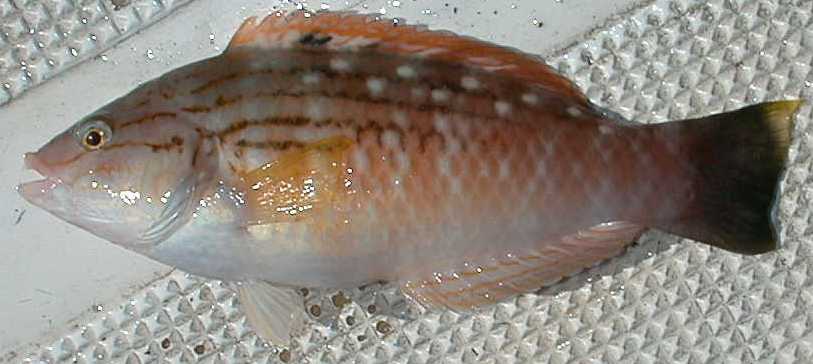 | コメント | カサゴ狙いの外道で釣れました。 Sampei注:写真では若干見難いですが、胸尾れの付け根が褐色を帯びているところからアカササノハベラと判断しました。 |