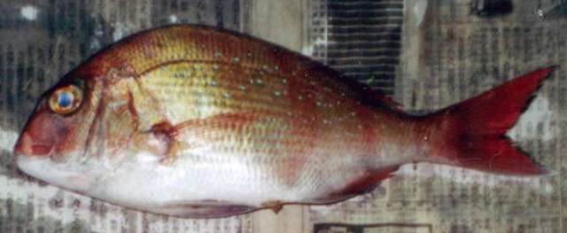 | 似た魚と見分け方 | チダイとの見分け方:マダイは尾鰭後縁が黒い。尻鰭の軟条が8本(チダイは9本) 尾鰭の後縁が黒いキダイは青い斑点がない。 |