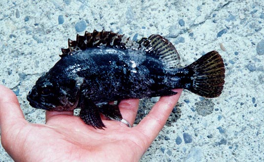 | 似た魚と見分け方 | 尾鰭後縁は丸く、体色は黒褐色、体に黒色斑が散在する。オウゴンムラソイは黄色斑が散在する。ヨロイメバルは胸鰭や腹鰭が赤っぽい。 背鰭13棘でカサゴ(背鰭12棘)とは区別がつきます(李太郎さん) |