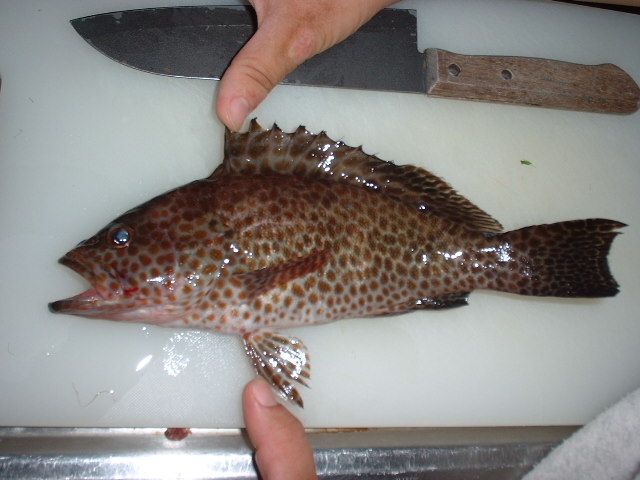 と奇妙なお魚・・・。キジハタを釣ったのは実は初めてで、強力な引きにエキサイトしてとても面白かったです。 * キジハタと投稿いただきましたが、尾鰭の特徴等からオオモンハタと判断しました |